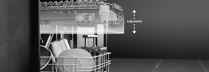 Deplasați coșul superior în sus pentru a crea mai mult spațiu pentru farfurii și vase de gătit mai mari în coșul inferior sau deplasați-l în jos pentru mai mult spațiu în coșul superior. Puteți muta coșul chiar și atunci când este complet încărcat.
